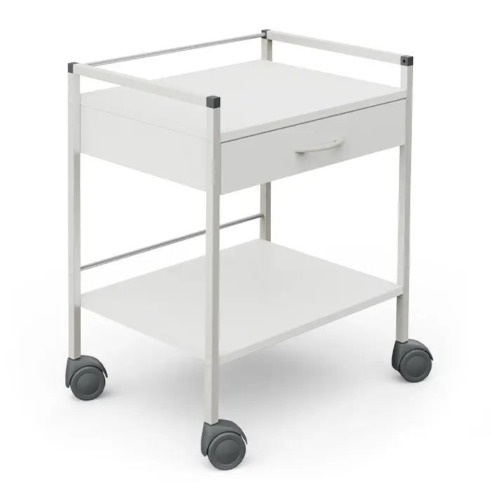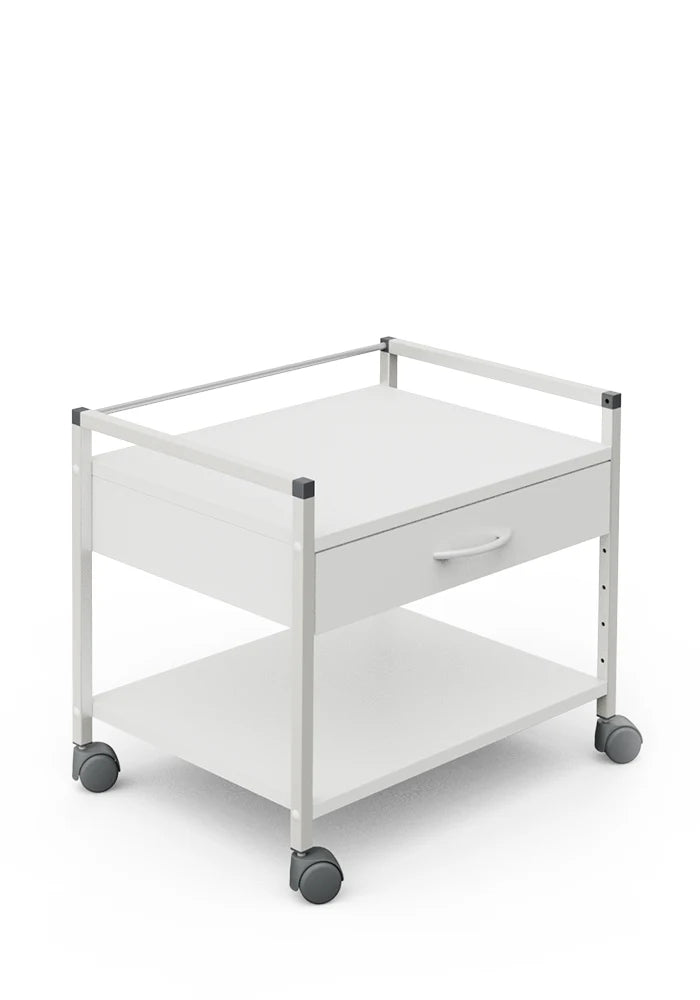 Stabiles Fahrgestell aus Vierkantstahlrohrbügeln in weiß kunststoffbeschichtet, pflegeleichte Platten, Schubladen mit leichtgängiger Kugel-Teleskop-Führung und Einrastmechanismus.