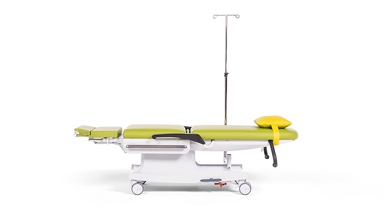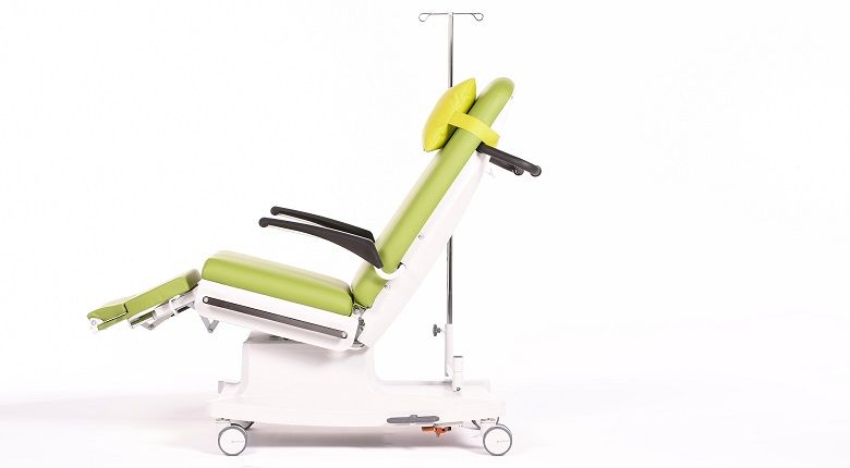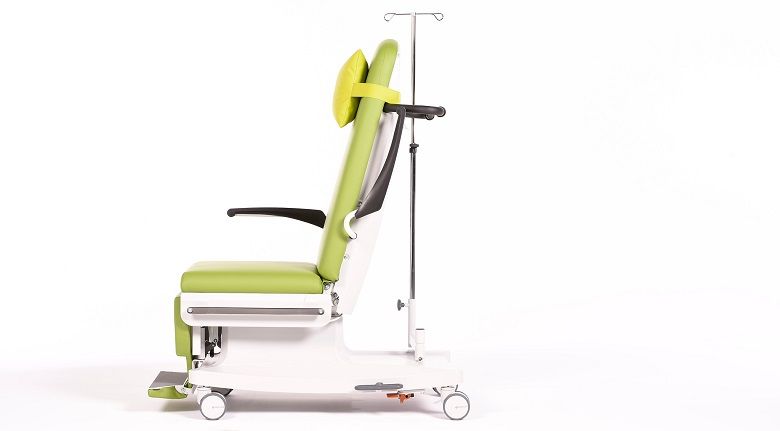 Diese neu entwickelte Therapieliege von GREINER verbindet die Leistungsfähigkeit hoch technisch ausgestatteter Liegen in kompakter Form auf engem Raum. Konzipiert für die mitunter schwächsten und von hochgradigen Krankheitsbildern betroffenen Patienten wird sie zum Begleiter in schwerer Zeit. Einfacher Einstieg, leichtgängige Rollen, verständliche Funktionen, stufenlos motorisierte Bewegungsabläufe in die Wunschposition, angenehme Armstützen und freundliche Farben der komfortablen Polsterung geben der Liege ihr Gesicht. Patientenkomfort, Ergonomie und Effizienz stehen im Mittelpunkt, wenn sie Patienten bei der über Stunden andauernden Chemotherapie beste Behandlungsbedingungen bietet.