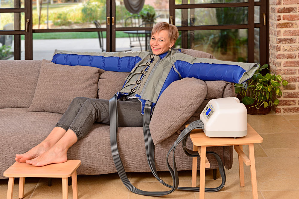 Die Jackenmanschette ermöglicht eine übergangslose Entstauung von den Fingerspitzen bis in die oberen Rumpfquadranten und verhindert Stauungen im Rücken- und Thoraxbereich. Durch die beidseitige Therapie wird eine Verschiebung des Ödems in andere Rumpfquadranten vermieden.