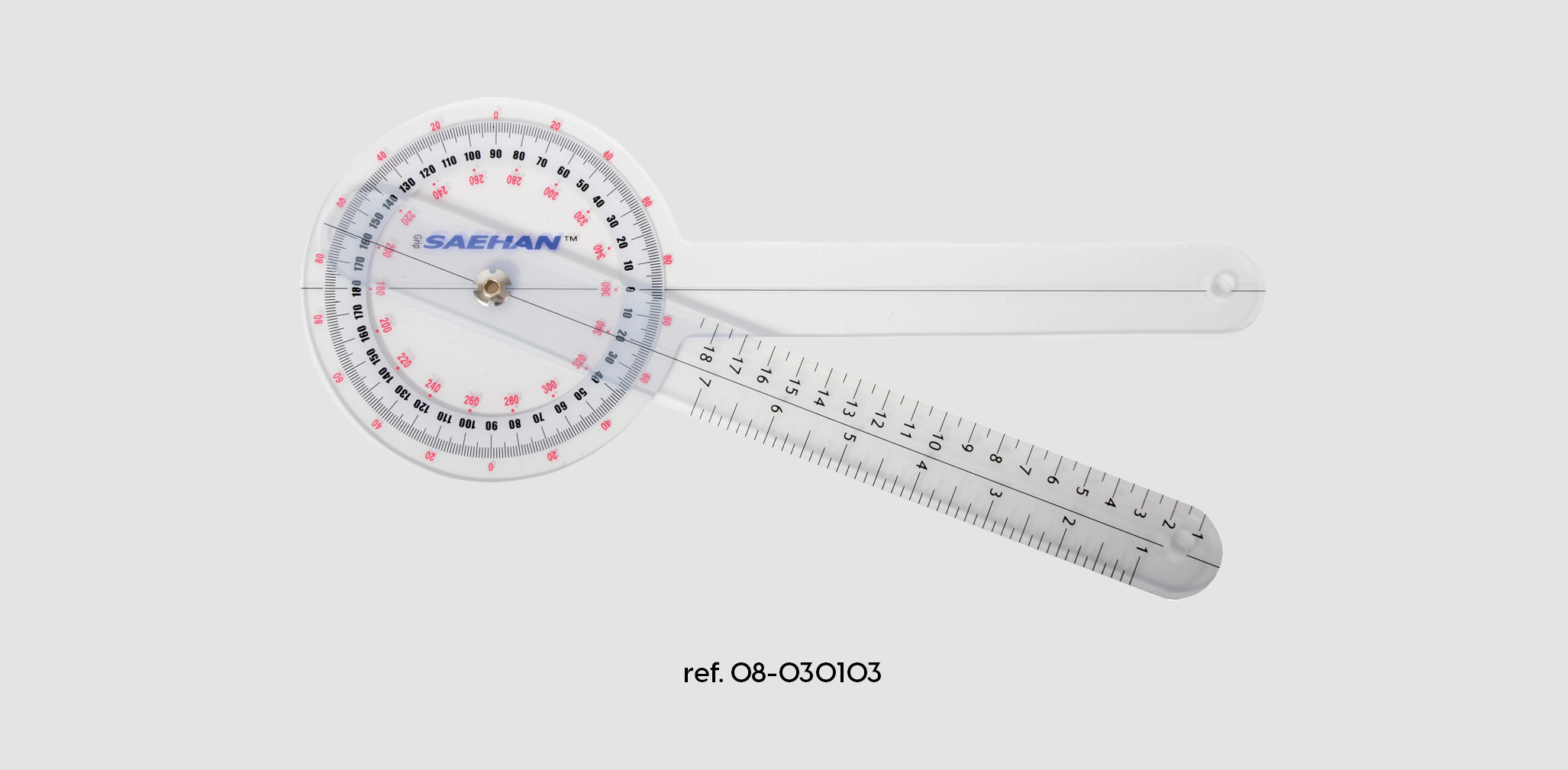 Der durchsichtige Kunststoff ermöglicht die Beobachtung der Bewegungsachse des Gelenks und seines Bewegungsbereichs. Der 360°-Kopf verfügt über drei Skalen, die für die Verwendung mit dem ISOM-System (International Standard Of Measurements, STFR) kalibriert sind.