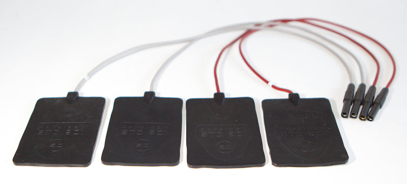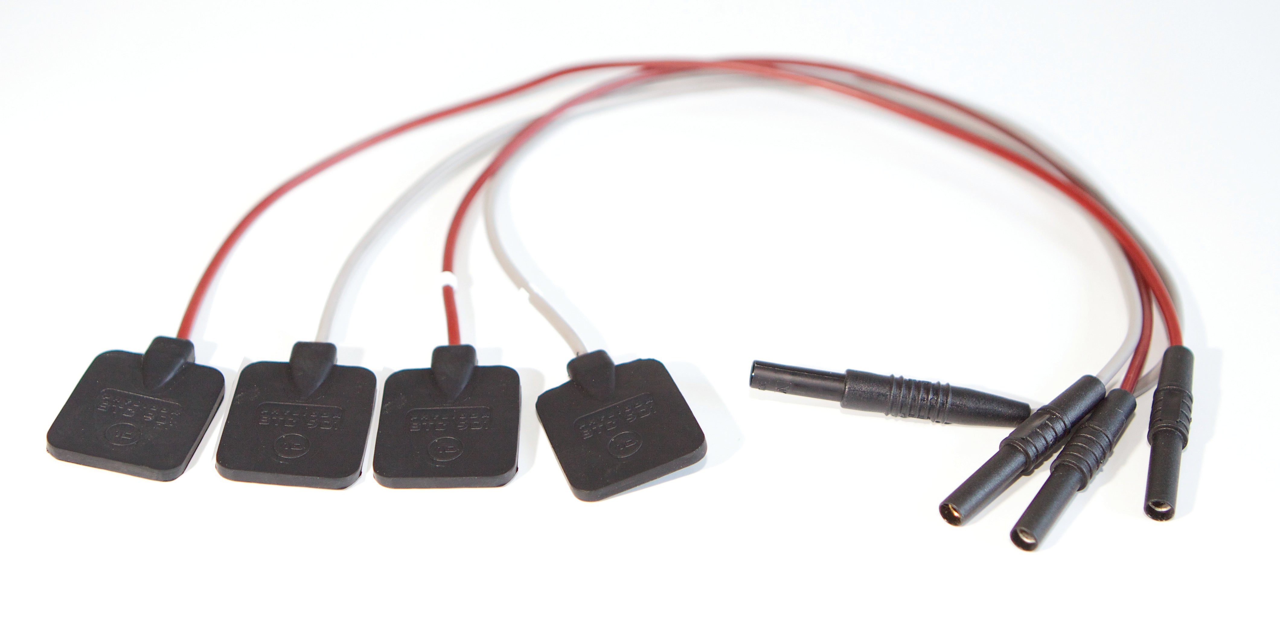 Elektrodenkabel per Plattenelektrode mit ca. 50 cm Länge, Sicherheitsstecker auf Elektrodenkabel dunkelrot, Pluspol (+) Anode und Elektrodenkabel hellgrau, Minuspol (–) Kathode montiert. Beachten Sie die Codierung für Plattenelektroden, die für den STC Therapiekanal B vorgesehen sind. Die Plattenelektroden für den Therapiekanal B über die entsprechenden Bestellnummern gesondert anfordern.